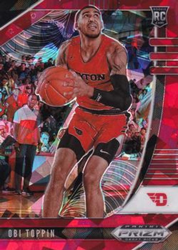 The Obi Toppin 2020 Prizm Draft Picks #47 Red Ice Rookie card is 1 of 124 Obi Toppin's card variations in the 2020 Prizm Draft Picks set being tracked by Sports Card Investor, including #7 Base, #87 Base, #47 Base, #7 Choice Blue Yellow Green, and #47 Choice Blue Yellow Green.
