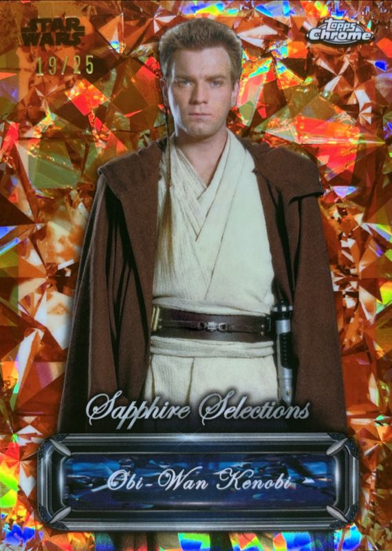 The Obi-Wan Kenobi 2024 Topps Chrome Sapphire Edition Star Wars: The Phantom Menace #SS-20 Sapphire Selections Orange /25 card is 1 of 53 Obi-Wan Kenobi's card variations in the 2024 Topps Chrome Sapphire Edition Star Wars: The Phantom Menace set being tracked by Sports Card Investor, including Base, Purple /125, Green /99, Yellow /75, and Gold /50.