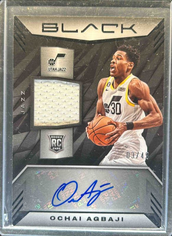 The Ochai Agbaji 2022 Black #RMA-OCA Rookie Memorabilia Autographs /35 card is 1 of 26 Ochai Agbaji's card variations in the 2022 Black set being tracked by Sports Card Investor, including Base, Silver /75, Copper /35, Gold /25, and Amethyst /15.