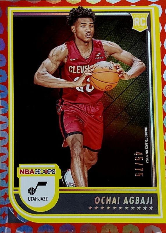 The Ochai Agbaji 2022 Hoops #244 Gravity /75 Rookie card in Raw condition has not changed in price in the last 30 days and was last sold for $16.00 .