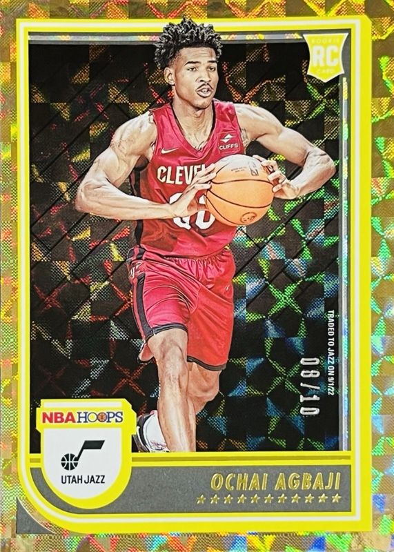The Ochai Agbaji 2022 Hoops #244 Hyper Gold /10 Rookie card in Raw condition has not changed in price in the last 30 days and was last sold for $30.00 .