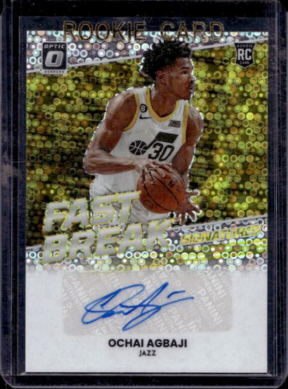 The Ochai Agbaji 2022 Optic #FBS-OAG Fast Break Signatures Rookie card is 1 of 84 Ochai Agbaji's card variations in the 2022 Optic set being tracked by Sports Card Investor, including Base, Checkerboard, Choice, Choice Red & Green, and Fast Break.
