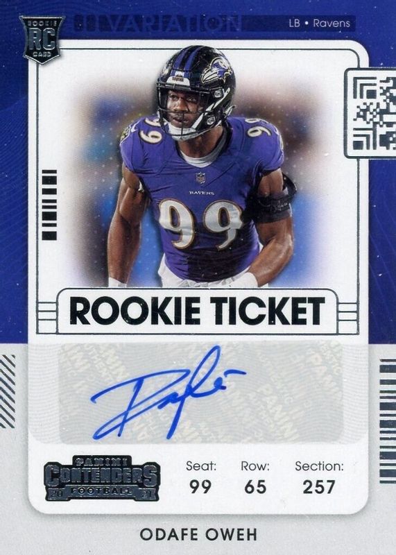 This card is 1 of 2 Odafe Oweh's card variations in the 2021 Contenders set being tracked by Sports Card Investor, including Rookie Ticket Auto.