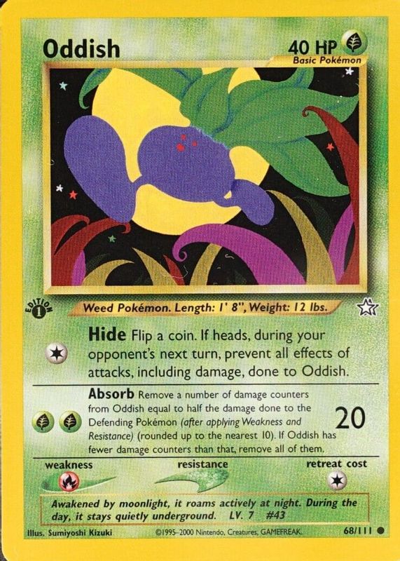The Oddish 2000 Neo Genesis #68/111 1st Edition card in Raw TCG (Near Mint) condition has moved down -$0.62 (-15.3%) in the last 30 days and was last sold for $3.42 .