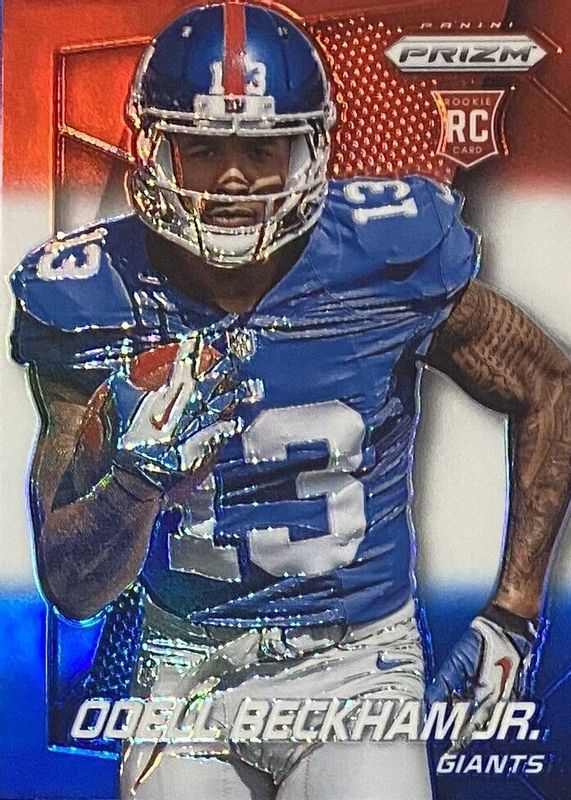 The Odell Beckham Jr. 2014 Prizm #282 Red White Blue Rookie card in Raw condition has not changed in price in the last 30 days and was last sold for $40.00 .
