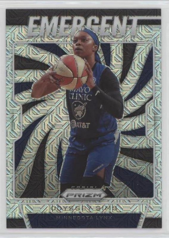 The Odyssey Sims 2020 Prizm WNBA #9 Emergent - Mojo /25 card is 1 of 52 Odyssey Sims' card variations in the 2020 Prizm WNBA set being tracked by Sports Card Investor, including Base, Green, Green Ice, Hyper, and Ice.