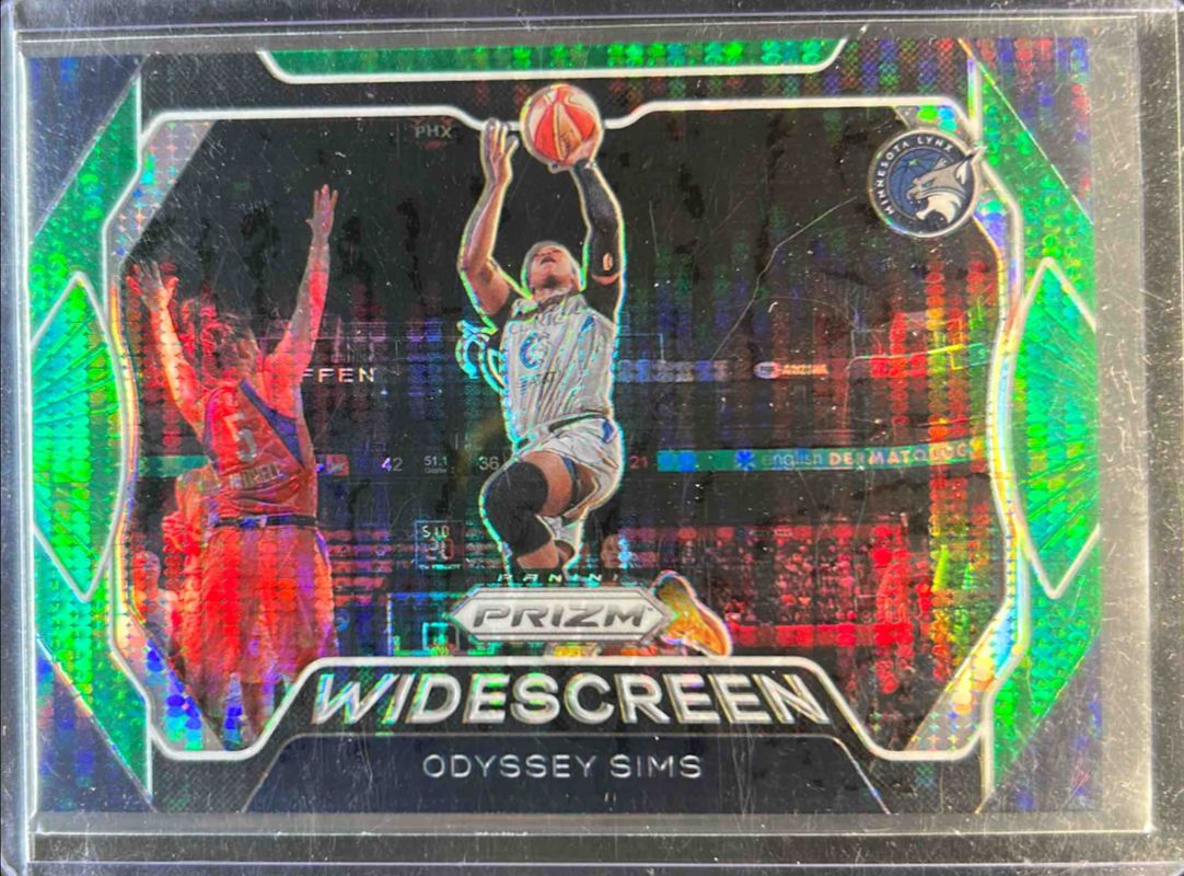 The Odyssey Sims 2020 Prizm WNBA #7 Widescreen - Green Pulsar /25 card is 1 of 52 Odyssey Sims' card variations in the 2020 Prizm WNBA set being tracked by Sports Card Investor, including Base, Green, Green Ice, Hyper, and Ice.