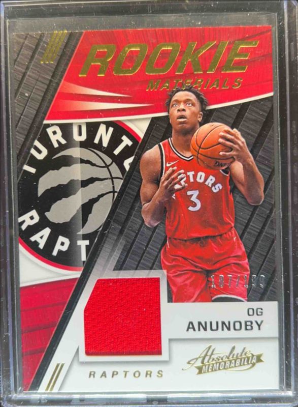 The OG Anunoby 2017 Absolute Memorabilia #RM-OGA Rookie - Materials /199 card is 1 of 23 OG Anunoby's card variations in the 2017 Absolute Memorabilia set being tracked by Sports Card Investor, including Base, Maroon /7, Tools of the Trade Three Swatch Signatures /149, Ink & Leather /99, and Pass the Rock Basketball Memorabilia /99.