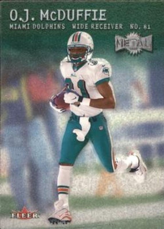 The OJ McDuffie 2000 Metal #45 Emerald card is 1 of 2 OJ McDuffie's card variations in the 2000 Metal set being tracked by Sports Card Investor, including Base.