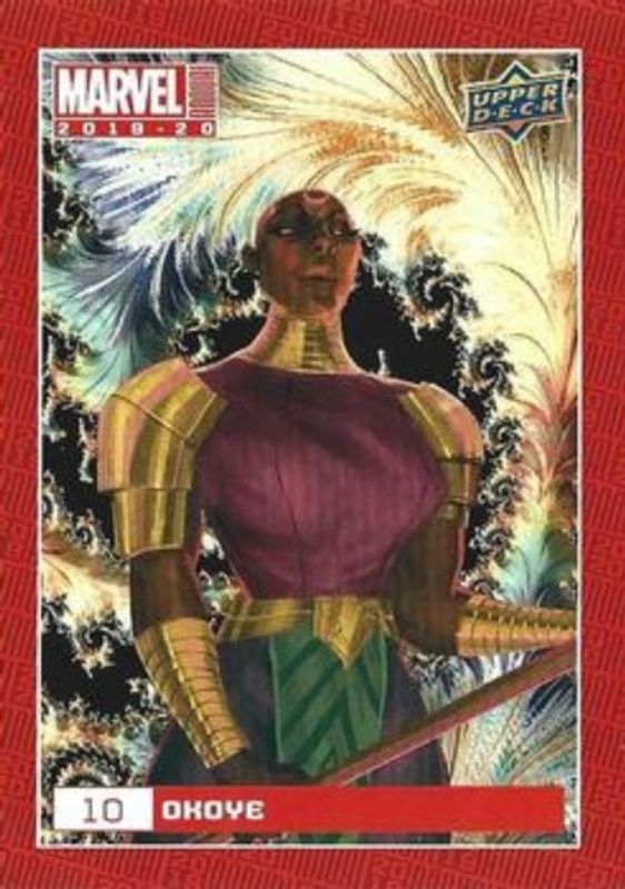 The Okoye 2019 Upper Deck Marvel Annual #10 Fractal card is 1 of 9 Okoye's card variations in the 2019 Upper Deck Marvel Annual set being tracked by Sports Card Investor, including Base, Pack Wars, Variant Cover, Hologram /20, and Printing Plate Cyan /1.