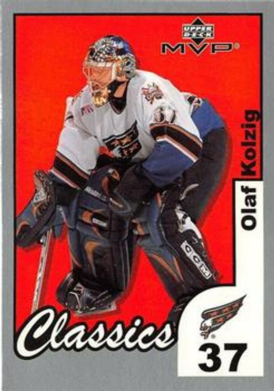 The Olaf Kolzig 2002 Upper Deck MVP #186 Classics card is 1 of 6 Olaf Kolzig's card variations in the 2002 Upper Deck MVP set being tracked by Sports Card Investor, including Base, Gold /100, Golden Classics /50, Masked Men, and Skate Around Jerseys /100.