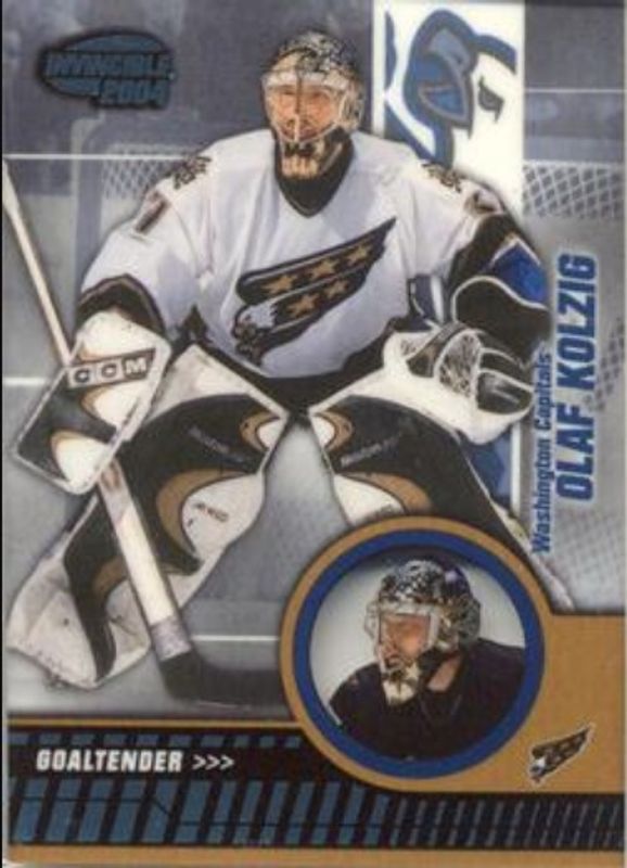The Olaf Kolzig 2003 Pacific Invincible #100 Blue /350 card is 1 of 6 Olaf Kolzig's card variations in the 2003 Pacific Invincible set being tracked by Sports Card Investor, including Base /799, Retail, Red /850, Freeze Frame, and Jerseys /375.