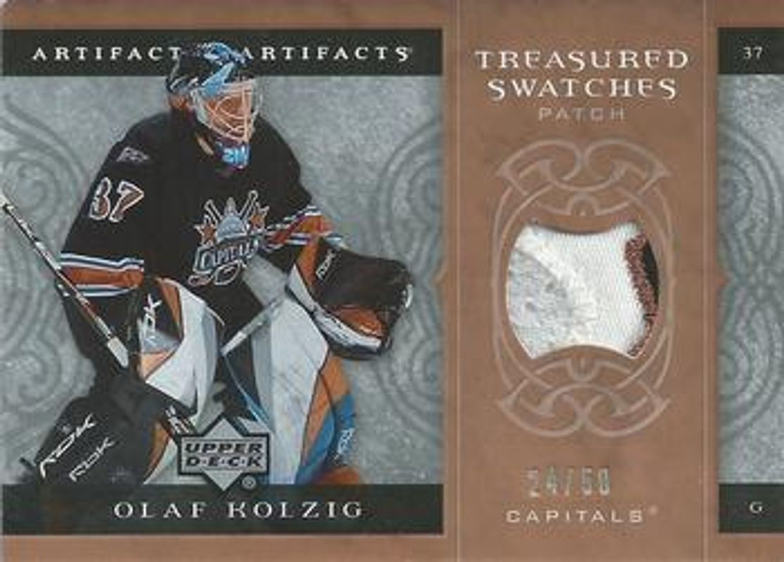 The Olaf Kolzig 2007 Upper Deck Artifacts #TS-OK Treasured Patches - Bronze /50 card is 1 of 17 Olaf Kolzig's card variations in the 2007 Upper Deck Artifacts set being tracked by Sports Card Investor, including Base /599, Silver /100, Gold /50, Blue /25, and Bronze /10.