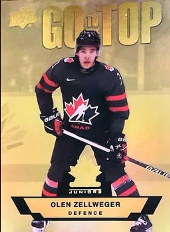 The Olen Zellweger 2023 Upper Deck Team Canada Juniors #GT-3 Go to the Top card is 1 of 71 Olen Zellweger's card variations in the 2023 Upper Deck Team Canada Juniors set being tracked by Sports Card Investor, including #124 Base, #3 Base, #69 Base, #124 Clear Cut, and #69 Clear Cut.