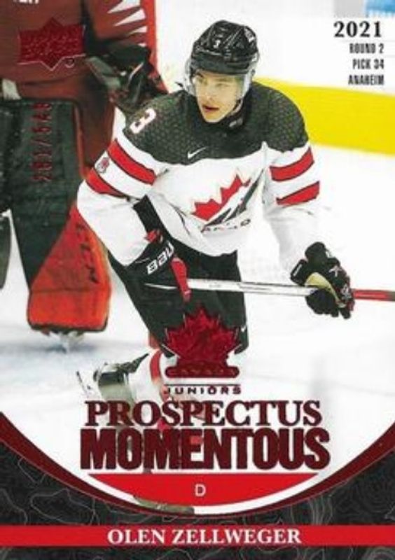The Olen Zellweger 2023 Upper Deck Team Canada Juniors #PM-6 Prospectus Momentous - Electric Red /549 card is 1 of 71 Olen Zellweger's card variations in the 2023 Upper Deck Team Canada Juniors set being tracked by Sports Card Investor, including #124 Base, #3 Base, #69 Base, #124 Clear Cut, and #69 Clear Cut.