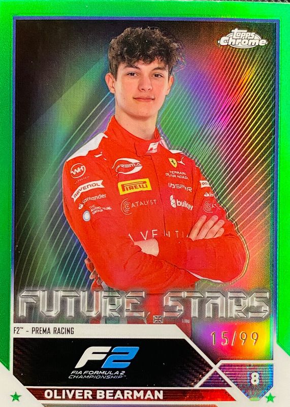 The Oliver Bearman 2023 Topps Chrome Formula 1 #71 Green Refractor /99 card in Raw condition has not changed in price in the last 30 days and was last sold for $29.70 .