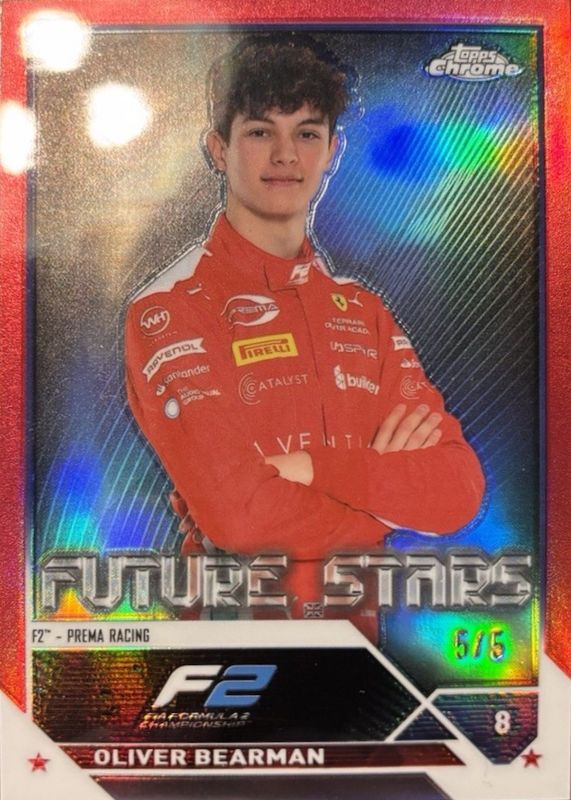 The Oliver Bearman 2023 Topps Chrome Formula 1 #71 Red Refractor /5 card in Raw condition has not changed in price in the last 30 days and was last sold for $900.00 .