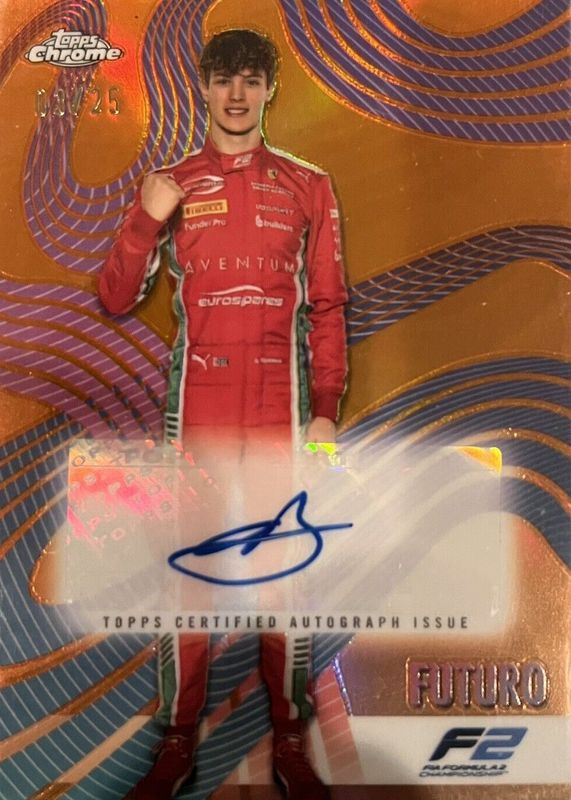 The Oliver Bearman 2024 Topps Chrome Formula 1 #FUT-BEA Futuro Autographs - Orange Refractor /25 card in Raw condition has not changed in price in the last 30 days and was last sold for $202.14 .