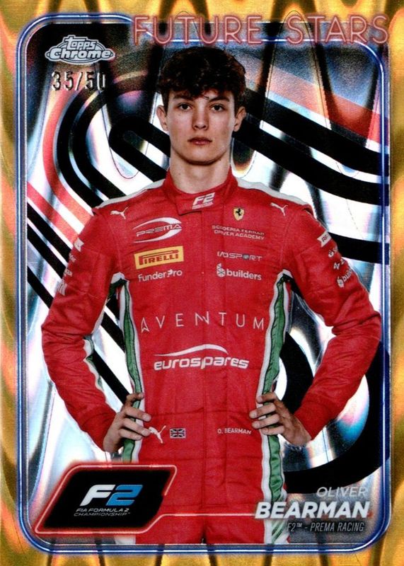 This card is 1 of 38 Oliver Bearman's card variations in the 2024 Topps Chrome Formula 1 set being tracked by Sports Card Investor, including Black & White RayWave Refractor, Checker Flag Refractor, Gold & Purple Refractor, Orange & Red Refractor, and Purple & Green Refractor.