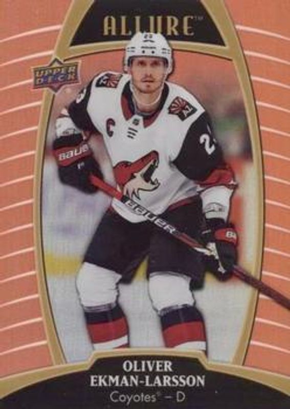The Oliver Ekman-Larsson 2019 Upper Deck Allure #47 Sunset card is 1 of 17 Oliver Ekman-Larsson's card variations in the 2019 Upper Deck Allure set being tracked by Sports Card Investor, including Base, Pewter, Red Rainbow, White Rainbow, and Yellow Taxi.