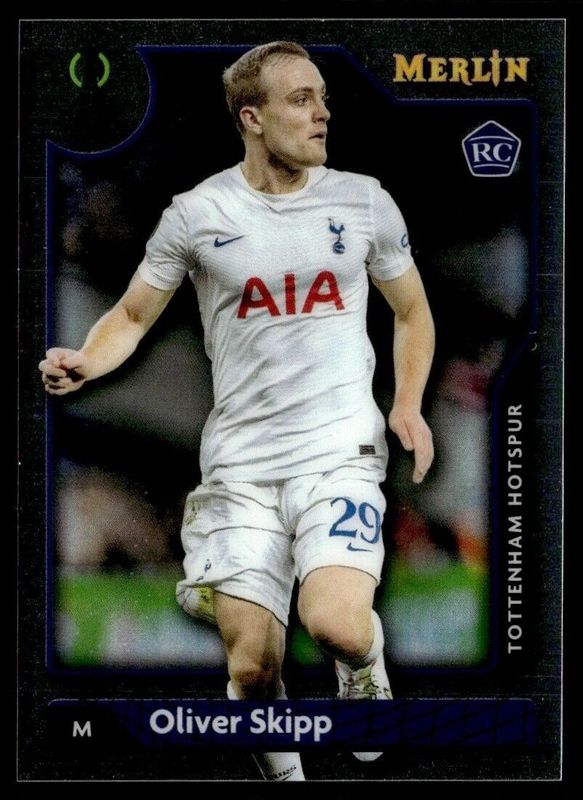 The Oliver Skipp 2021 Topps Merlin Chrome UEFA Champions League #29 Base Rookie card is 1 of 22 Oliver Skipp's card variations in the 2021 Topps Merlin Chrome UEFA Champions League set being tracked by Sports Card Investor, including Aqua Prism Refractor, Refractor, Pink Mojo Refractor /275, Atomic Refractor /250, and Yellow Wave Refractor /225.
