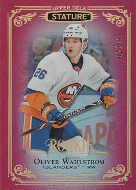 The Oliver Wahlstrom 2019 Upper Deck Stature #178 Red /75 Rookie card is 1 of 27 Oliver Wahlstrom's card variations in the 2019 Upper Deck Stature set being tracked by Sports Card Investor, including Base /399, Autographs /199, Green /149, Autographs Green /85, and Portrait Variant /85.
