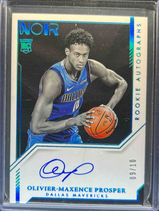 The Olivier-Maxence Prosper 2023 Noir #391 Platinum /10 Rookie card is 1 of 37 Olivier-Maxence Prosper's card variations in the 2023 Noir set being tracked by Sports Card Investor, including #391 Base /99, #309 Base /99, #349 Base /99, #391 Gold /25, and #EDR-OMP Elegant Décor Rookie Jerseys /99.