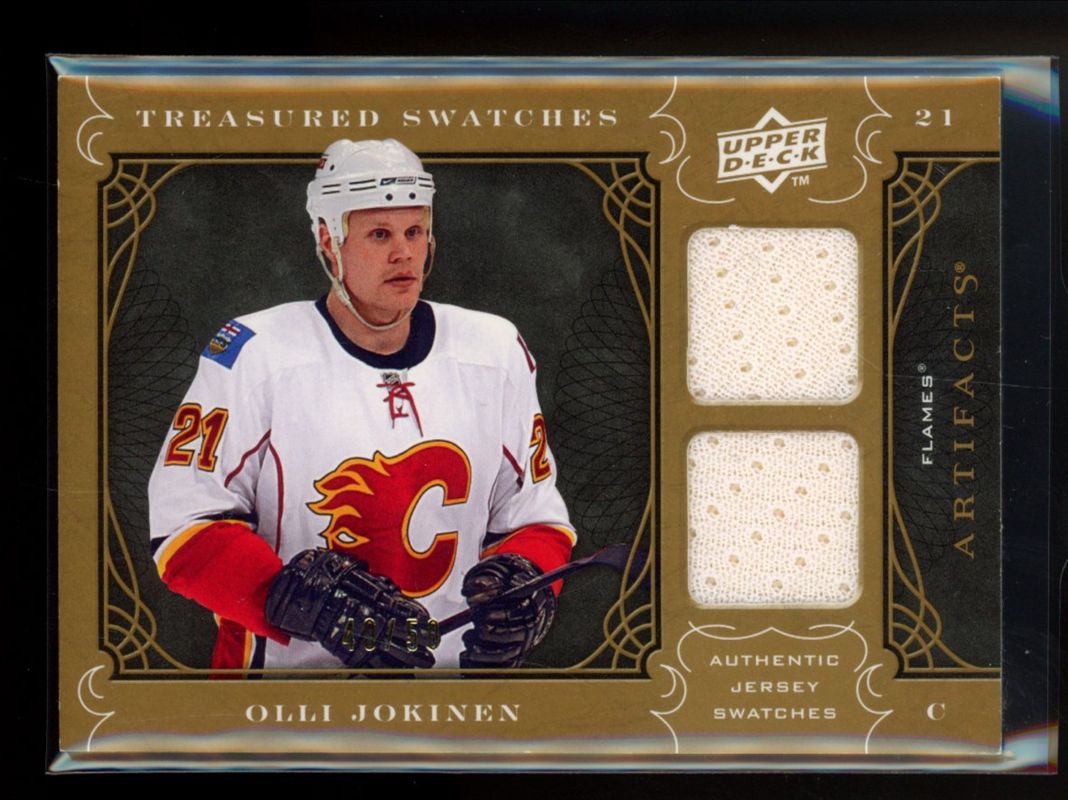 The Olli Jokinen 2009 Upper Deck Artifacts #TS-OJ Treasured Swatches Copper /50 card is 1 of 15 Olli Jokinen's card variations in the 2009 Upper Deck Artifacts set being tracked by Sports Card Investor, including Base /699, Silver /75, Gold /50, Silver Spectrum /25, and Gold Spectrum /10.