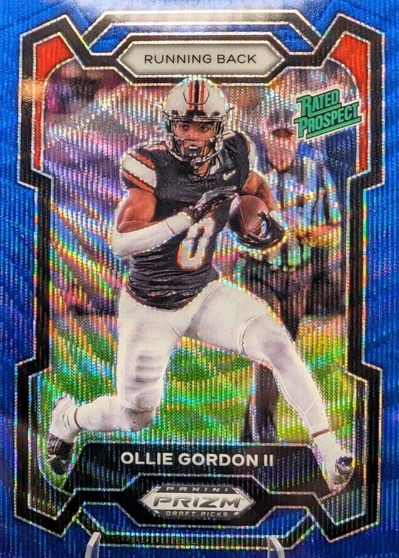 The Ollie Gordon II 2024 Prizm Draft Picks #102 Blue Wave /249 card in Raw condition has not changed in price in the last 30 days and was last sold for $1.84 .