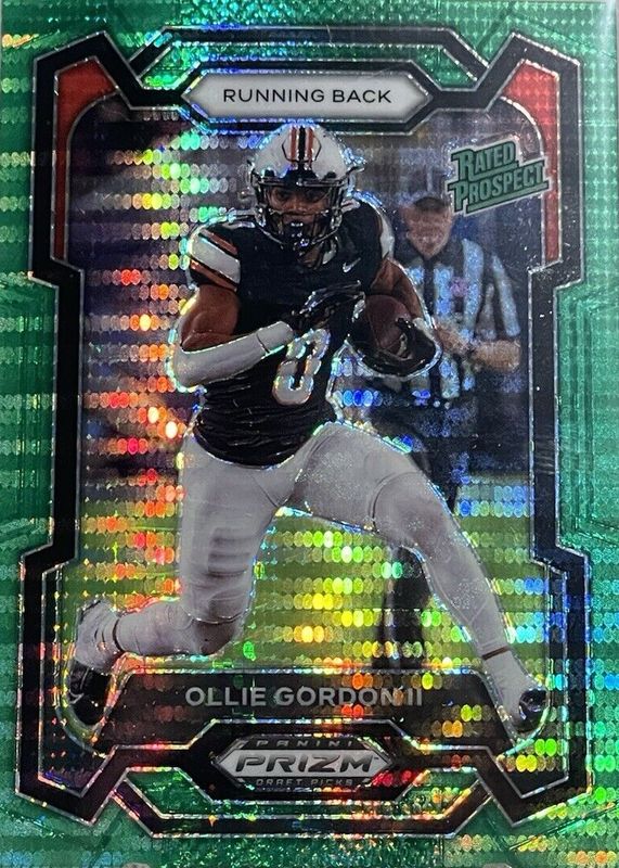 The Ollie Gordon II 2024 Prizm Draft Picks #102 Green Pulsar /25 card in Raw condition has not changed in price in the last 30 days and was last sold for $6.36 .