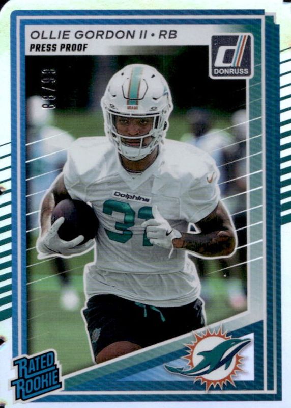 This card is 1 of 29 Ollie Gordon II's card variations in the 2025 Donruss set being tracked by Sports Card Investor, including Base, Aqueous Test, Canvas, Jersey Number (/31), and No Name.