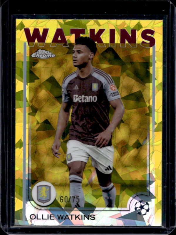 The Ollie Watkins 2024 Topps Chrome Sapphire UEFA Club Competitions #33 Yellow /75 card is 1 of 21 Ollie Watkins' card variations in the 2024 Topps Chrome Sapphire UEFA Club Competitions set being tracked by Sports Card Investor, including Base, Green /99, Gold /50, Orange /25, and Black /10.