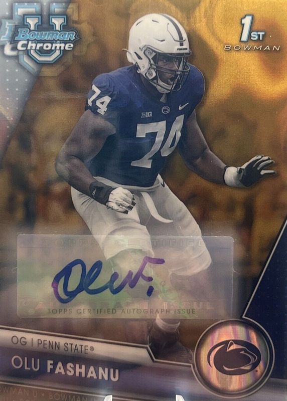 Best Prices Available For Sale of Olu Fashanu 2023 Bowman Chrome University #122 Prospect Auto - Gold Lava Refractor /50 (1st)