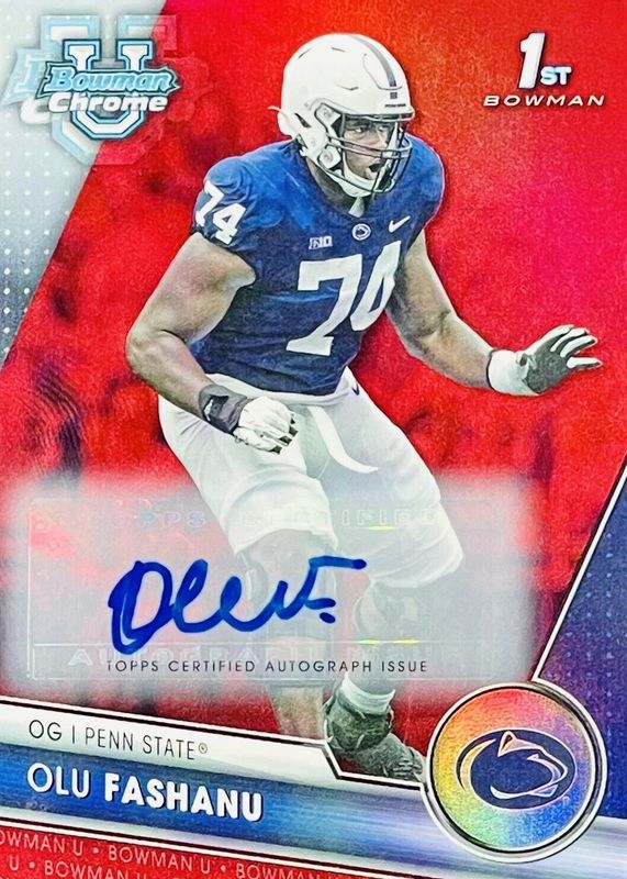 The Olu Fashanu 2023 Bowman Chrome University #122 Prospect Auto - Red Refractor /5 (1st) card in Raw condition has not changed in price in the last 30 days and was last sold for $76.00 .