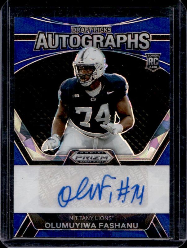 The Olu Fashanu 2024 Prizm Draft Picks #DPA-OFU Draft Picks Autographs - Blue Ice /75 Rookie card is 1 of 79 Olu Fashanu's card variations in the 2024 Prizm Draft Picks set being tracked by Sports Card Investor, including Base, Green, Purple Wave, Red Ice, and Ruby Wave.
