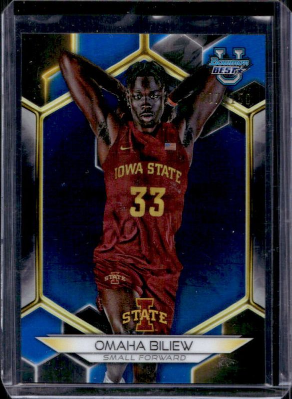 The Omaha Biliew 2023 Bowman Best University #31 Blue Refractor /150 card is 1 of 49 Omaha Biliew's card variations in the 2023 Bowman Best University set being tracked by Sports Card Investor, including Base, Refractor, Speckle Refractor, Pink Lava Refractor /100, and Green Mini-Diamond Refractor /99.