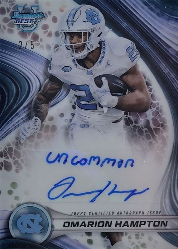 The Omarion Hampton 2024 Bowman Best University #BOA-OH Best of 2024 Autographs - White Refractor /5 card in Raw condition has not changed in price in the last 30 days and was last sold for $180.27 .