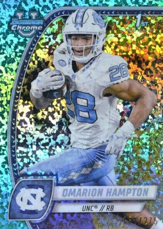 This card is 1 of 46 Omarion Hampton's card variations in the 2024 Bowman Chrome University set being tracked by Sports Card Investor, including Base (1st), Image Variation (1st), Pink Lava Refractor (1st), Purple Shimmer Refractor (1st), and Refractor (1st).