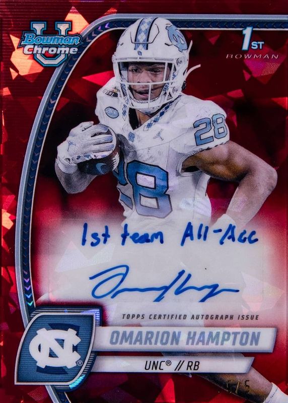Auctions Ending Soon for Omarion Hampton 2024 Bowman Chrome University Sapphire Edition #PA-OHA Prospect Auto - Red /5 (1st) RAW