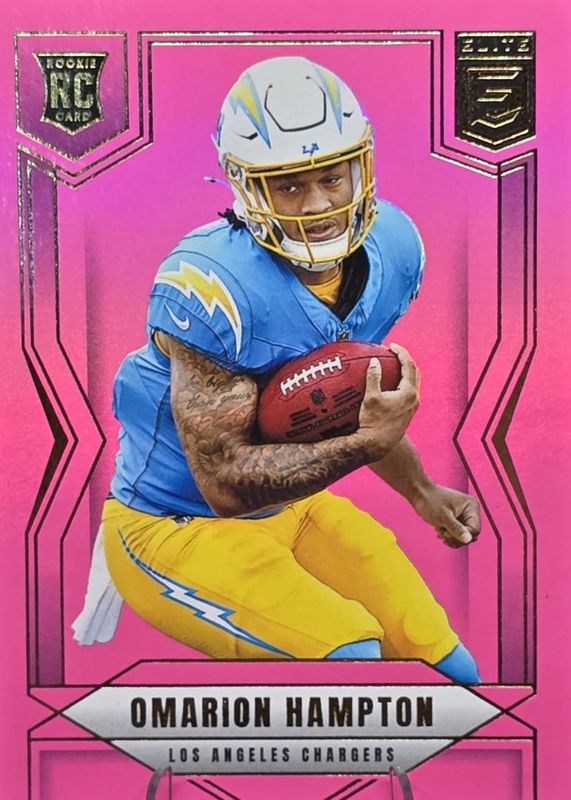 The Omarion Hampton 2025 Elite #132 Pink Rookie card in Raw condition has moved down -$2.25 (-45.0%) in the last 30 days and was last sold for $2.75 .