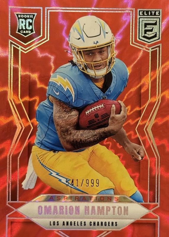 This card is 1 of 33 Omarion Hampton's card variations in the 2025 Elite set being tracked by Sports Card Investor, including Base Rookie /999, Aspirations (/92), Green Disco, Pink, and Status (/8).