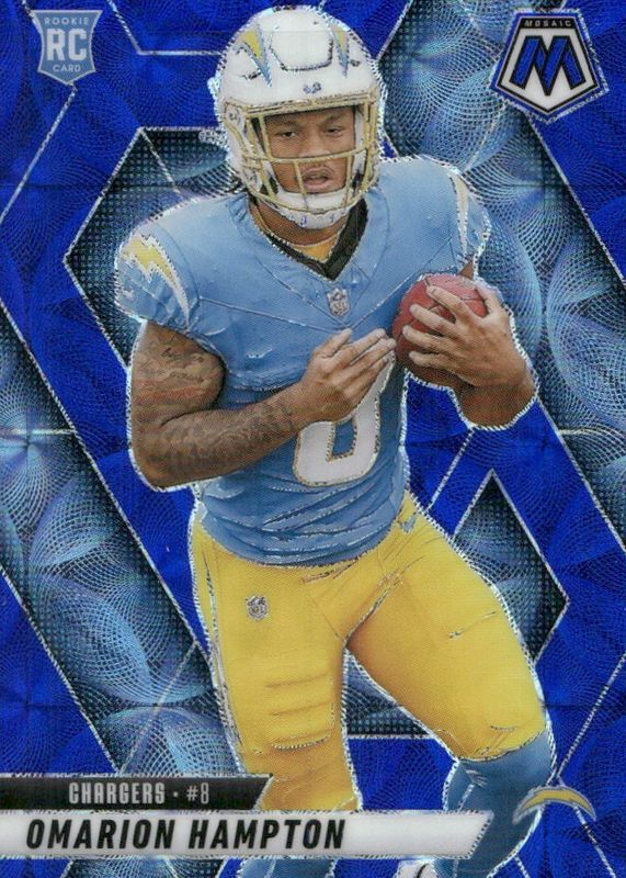 The Omarion Hampton 2025 Mosaic #335 Blue Scope Rookie card in Raw condition has moved down -$2.49 (-24.9%) in the last 30 days and was last sold for $7.50 .