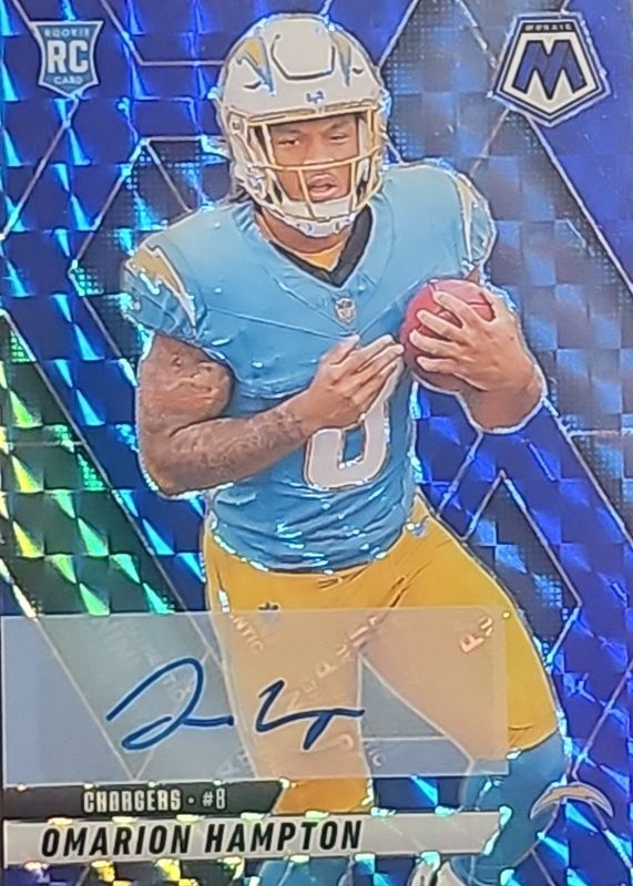 The Omarion Hampton 2025 Mosaic #335 Rookie Autographs - Blue /99 card in Raw condition has moved up $6.00 (+11.1%) in the last 30 days and was last sold for $60.00 .