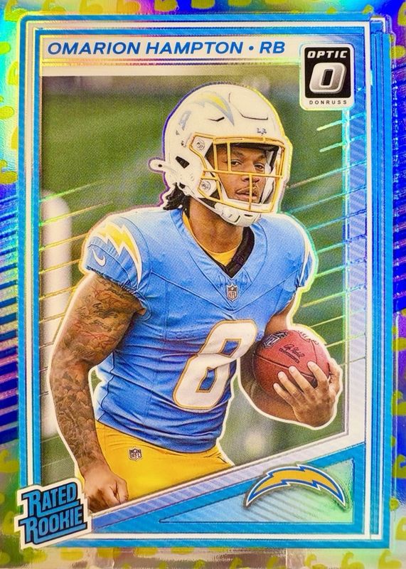 This card is 1 of 130 Omarion Hampton's card variations in the 2025 Optic set being tracked by Sports Card Investor, including Base, Blue Hyper, Blue Scope, Green Hyper, and Green Velocity.