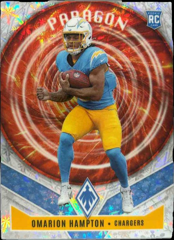 The Omarion Hampton 2025 Phoenix #9 Paragon - Blue /199 Rookie card is 1 of 231 Omarion Hampton's card variations in the 2025 Phoenix set being tracked by Sports Card Investor, including Base, Silver, Silver Hyper, Silver Lava, and Silver Lazer.