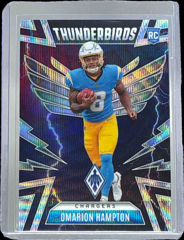The Omarion Hampton 2025 Phoenix #28 Thunderbirds - Wave /299 Rookie card is 1 of 231 Omarion Hampton's card variations in the 2025 Phoenix set being tracked by Sports Card Investor, including Base, Silver, Silver Hyper, Silver Lava, and Silver Lazer.