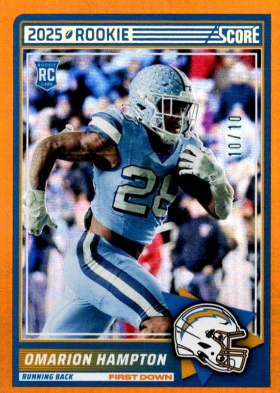 The Omarion Hampton 2025 Score #37 First Down /10 Rookie card in Raw condition has not changed in price in the last 30 days and was last sold for $52.49 .