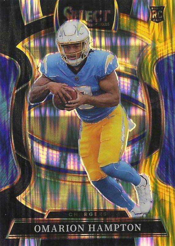 This card is 1 of 291 Omarion Hampton's card variations in the 2025 Select set being tracked by Sports Card Investor, including Club Level, Concourse, Field Level, Premier Level, and Club Level Black & Blue Shock.