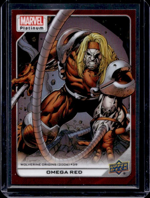The Omega Red 2023 Upper Deck Marvel Platinum #200 Red Rainbow card is 1 of 30 Omega Red's card variations in the 2023 Upper Deck Marvel Platinum set being tracked by Sports Card Investor, including Base, Black Rainbow, Blue Rainbow, Blue Surge, and Purple Rainbow.