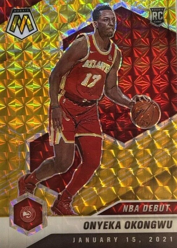 The Onyeka Okongwu 2020 Mosaic #274 NBA Debut - Gold /10 Rookie card in Raw condition has not changed in price in the last 30 days and was last sold for $50.00 .